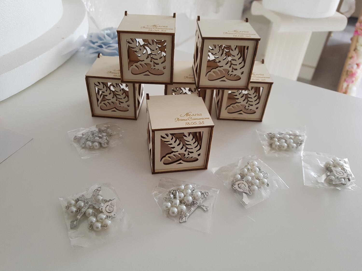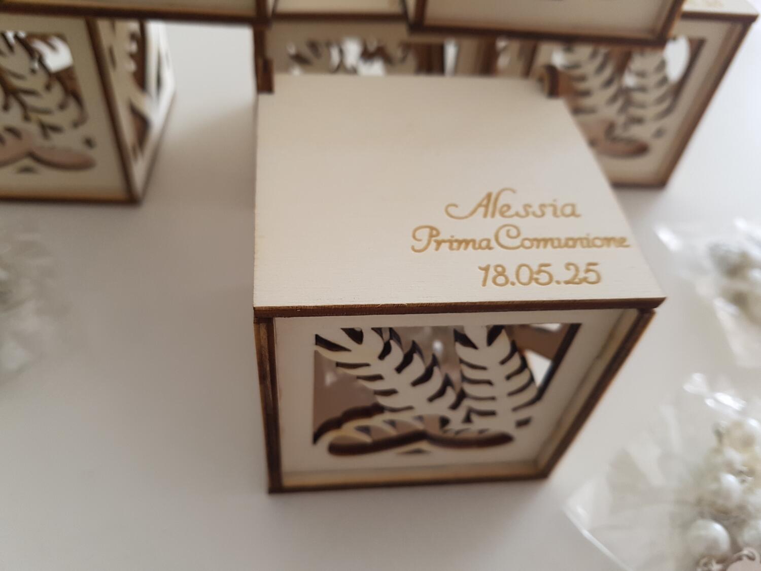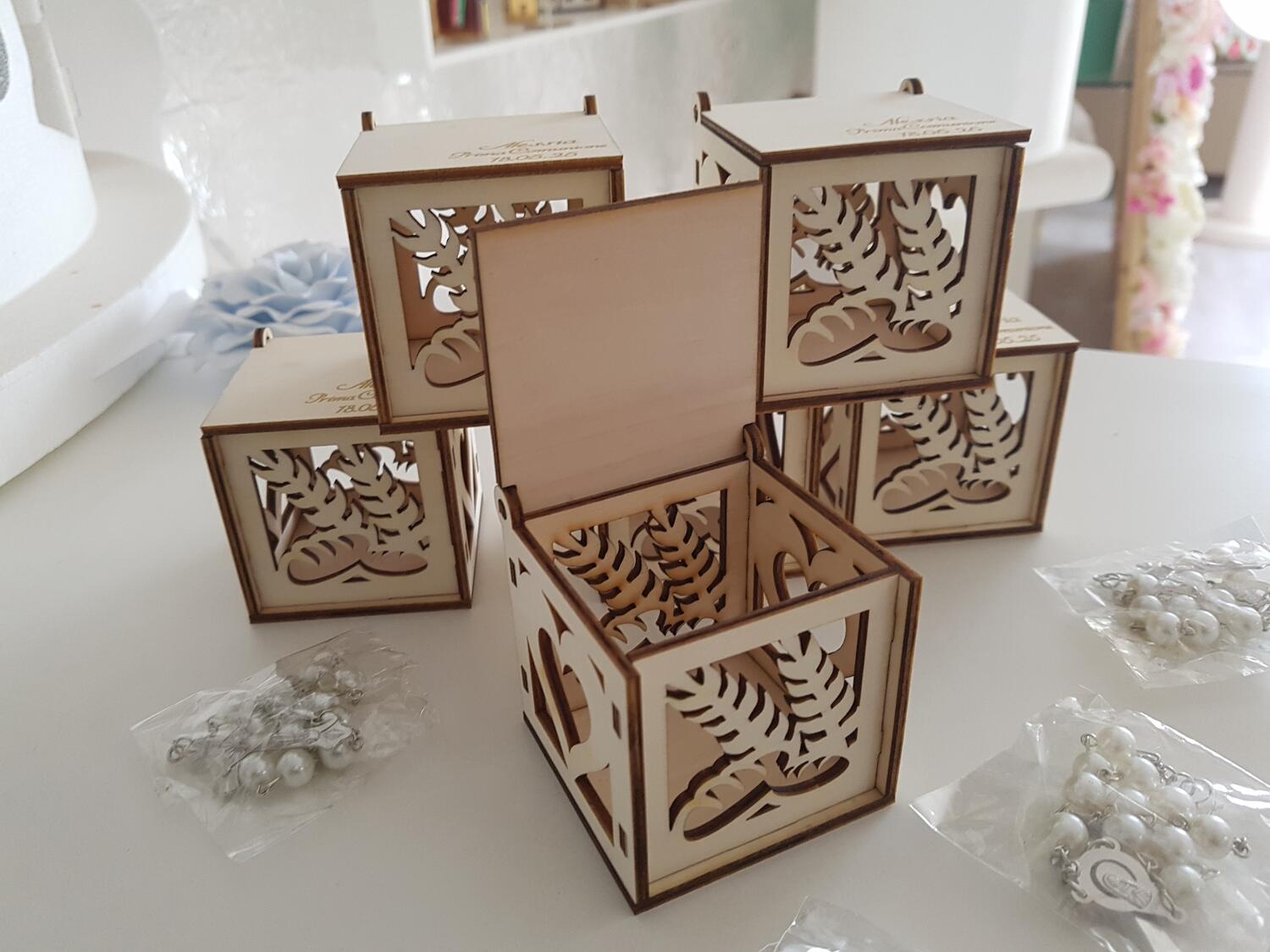 Scatole in legno per confetti, disegno cuore su due lati spiga su altri due lati
